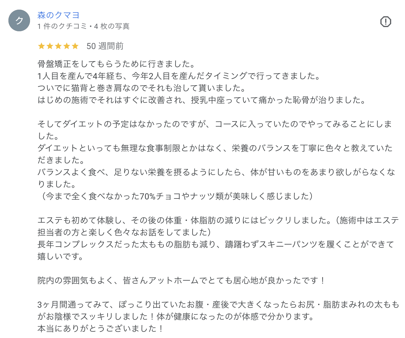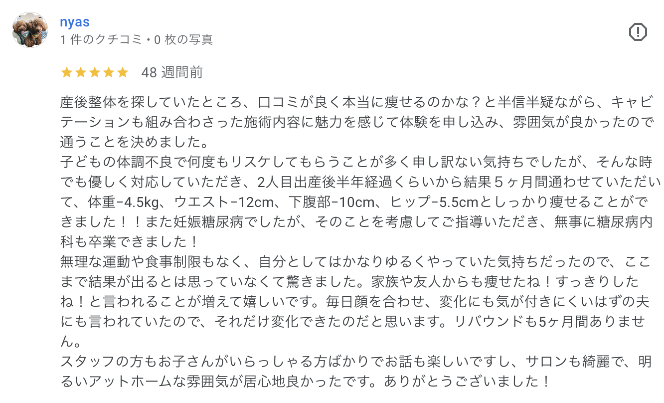 無事に糖尿病内科も卒業できました! 公開日:2025年8月7日 喜びの声 産後整体を探していたところ、口コミが良く本当に痩せるのかな?と半信半疑ながら、キャビテーションも組み合わさった施術内容に魅力を感じて体験を申し込み、雰囲気が良かったので通うことを決めました。 子どもの体調不良で何度もリス […] 続きを読む